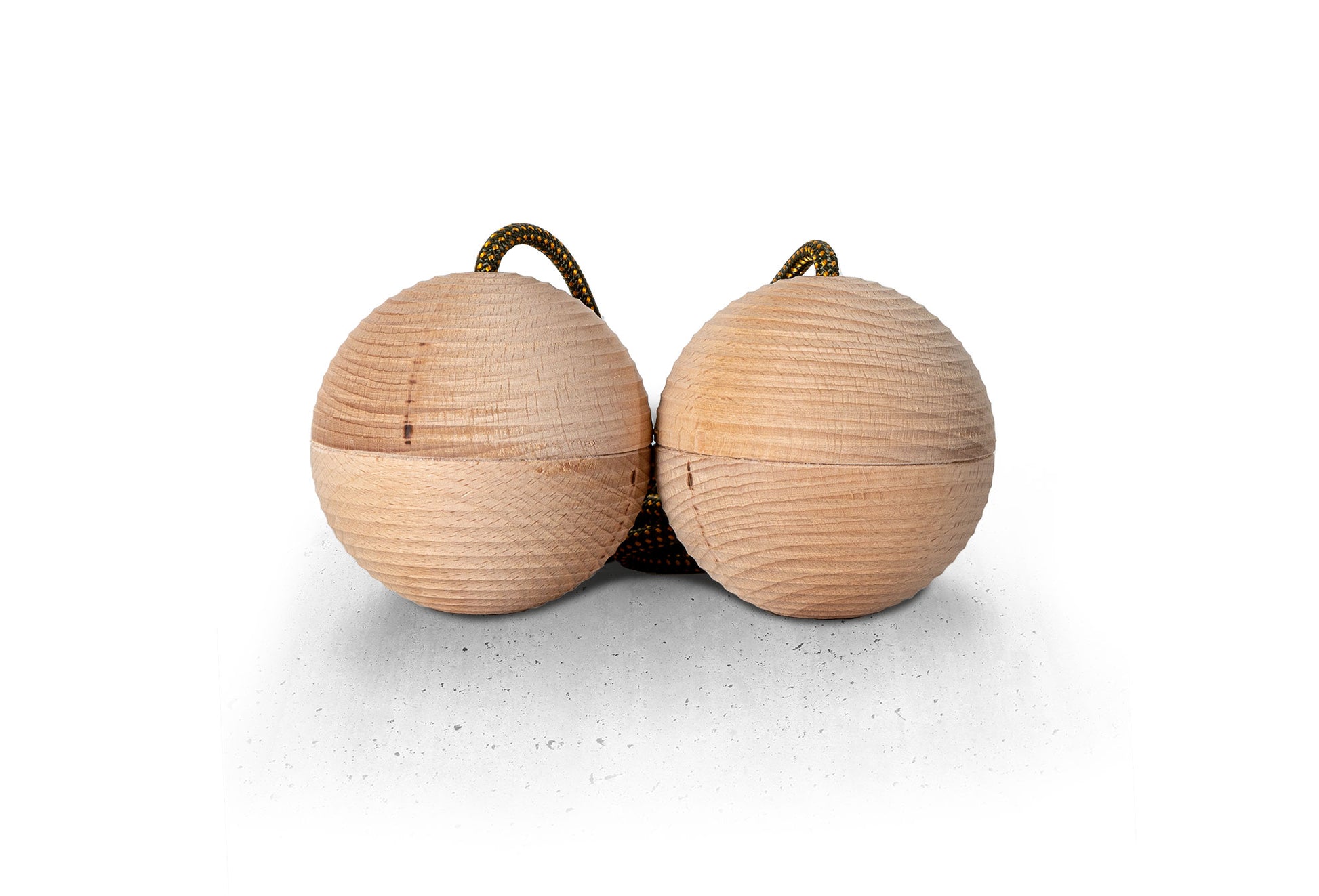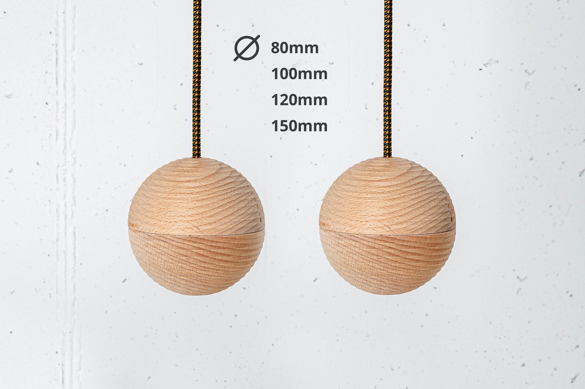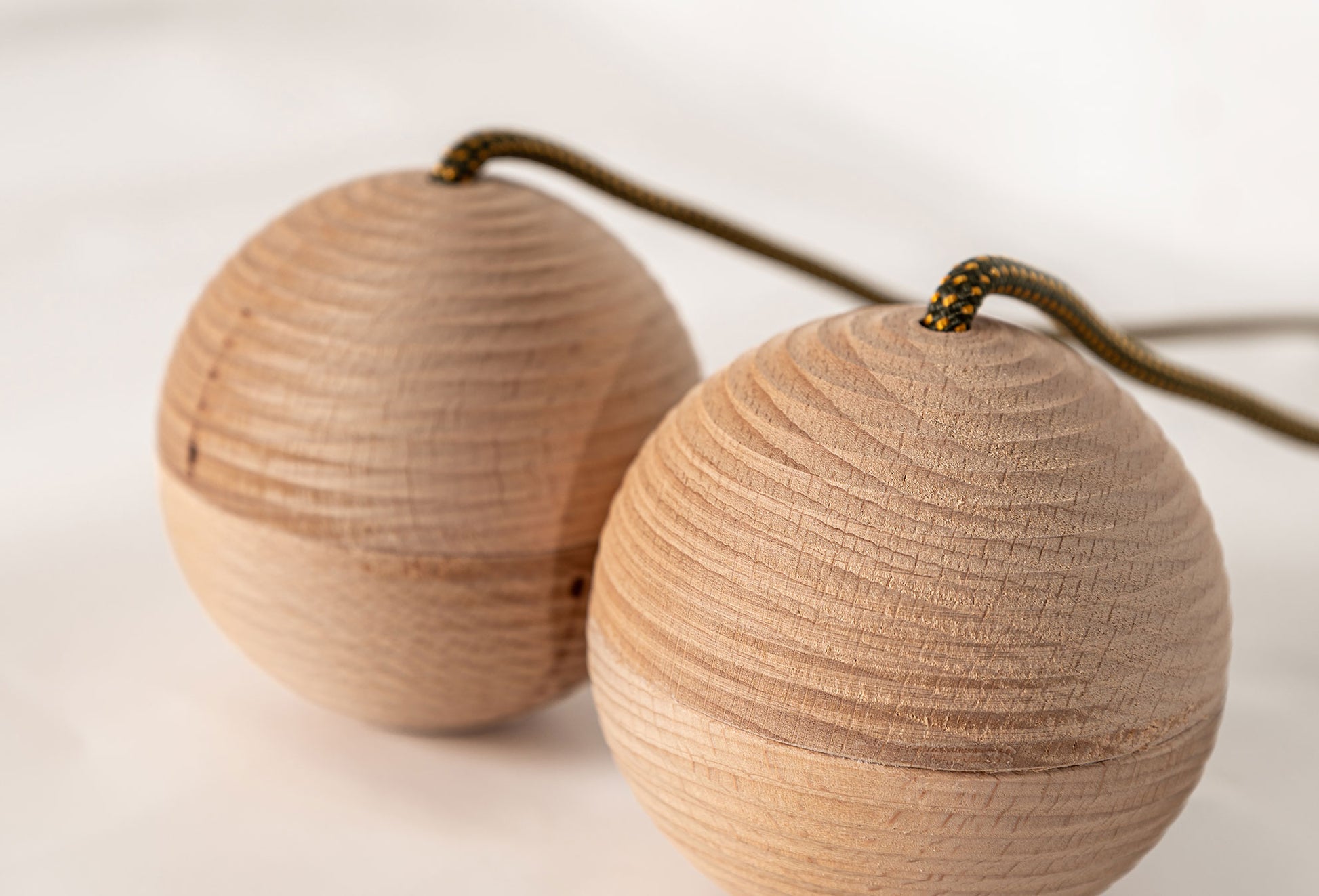 Las bolas de entrenamiento de madera de haya maciza son especialmente adecuadas para el entrenamiento de fuerza y están provistas de una nervadura especial para un mejor agarre. Están disponibles en tamaños (diámetro) de 80 mm, 100 mm, 120 mm y 150 mm. Con un metro de cable por bola, son aptas para entrenar en casa y en cualquier lugar.